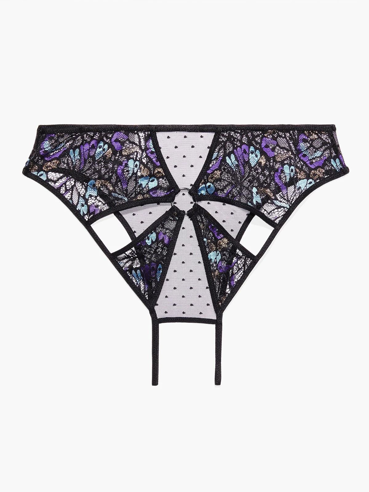 Discover your metamorphosis in our Butterfly Wings Lace & Mesh Crotchless Knickers, featuring a mid-rise silhouette, a point d’esprit mesh front body, and butterfly-shaped lace cutouts that gather into a ring in the back.