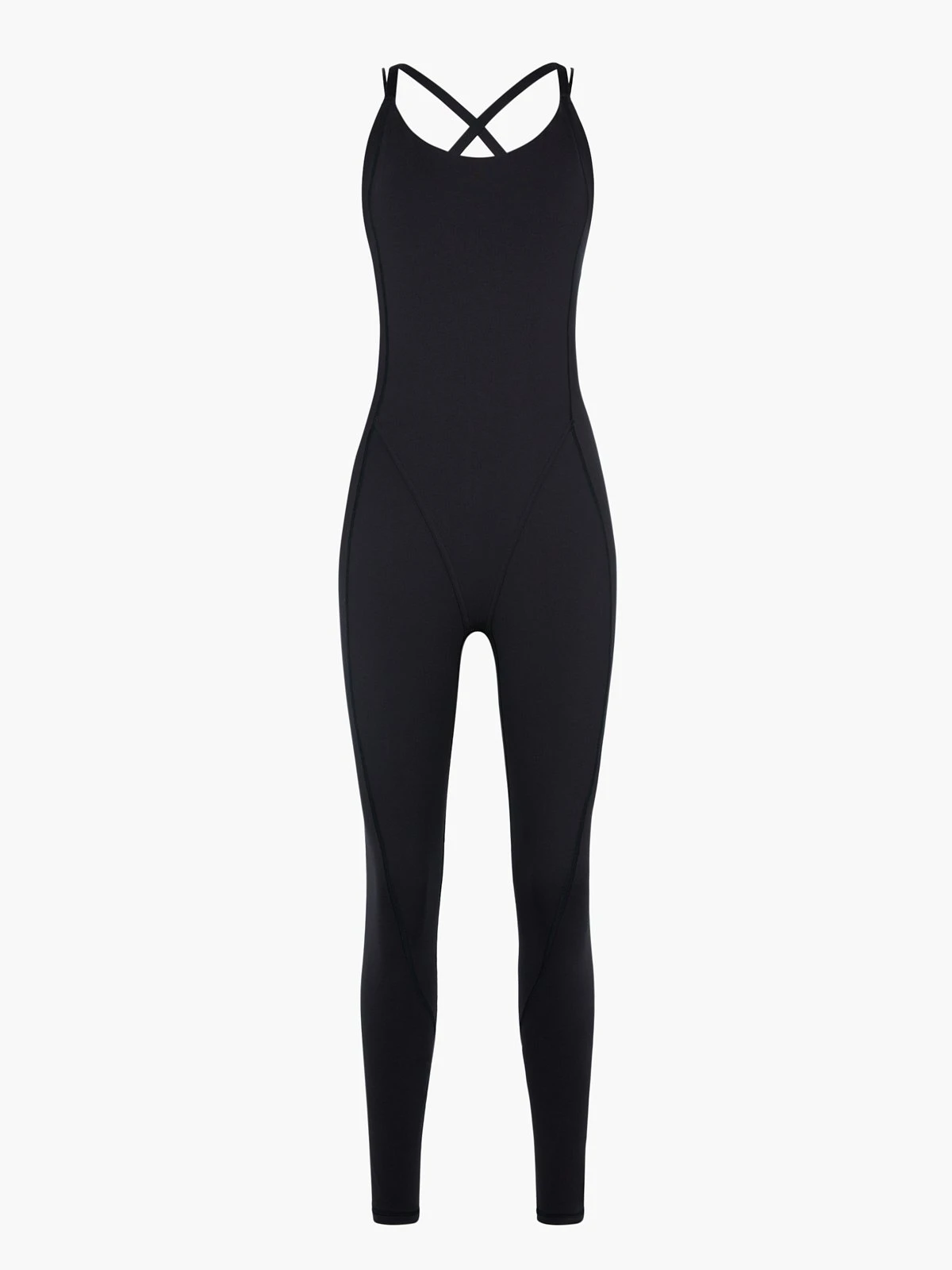 All about that silhouette! Our Curve Alert Jumpsuit features a built-in shelf bra, a smoothing panel for a snatched look, adjustable crisscross back straps, a back keyhole cutout, and flat-lock stitching that moves with your body.