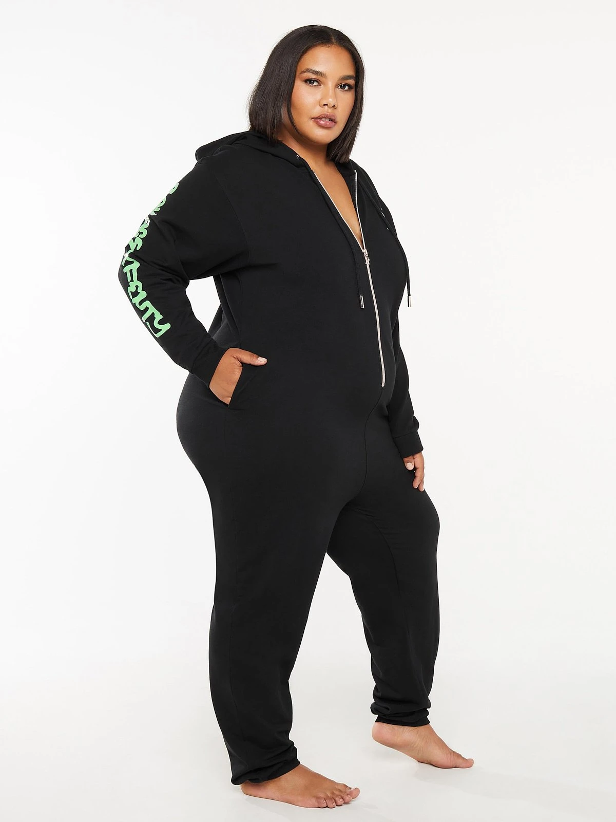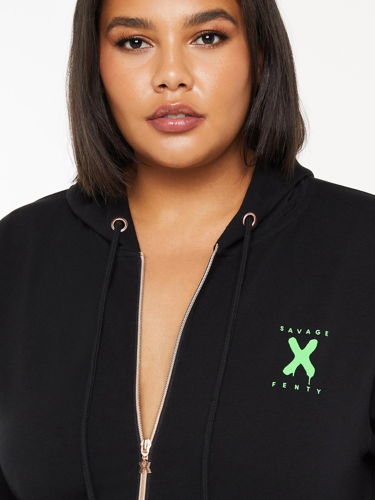 Our best-selling Forever Savage Hooded Onesie with a Fashion Show Xclusive update. With the same soft feel as our original, our new hooded onesie features a custom Savage X Fenty graphic showgirl on the right arm.