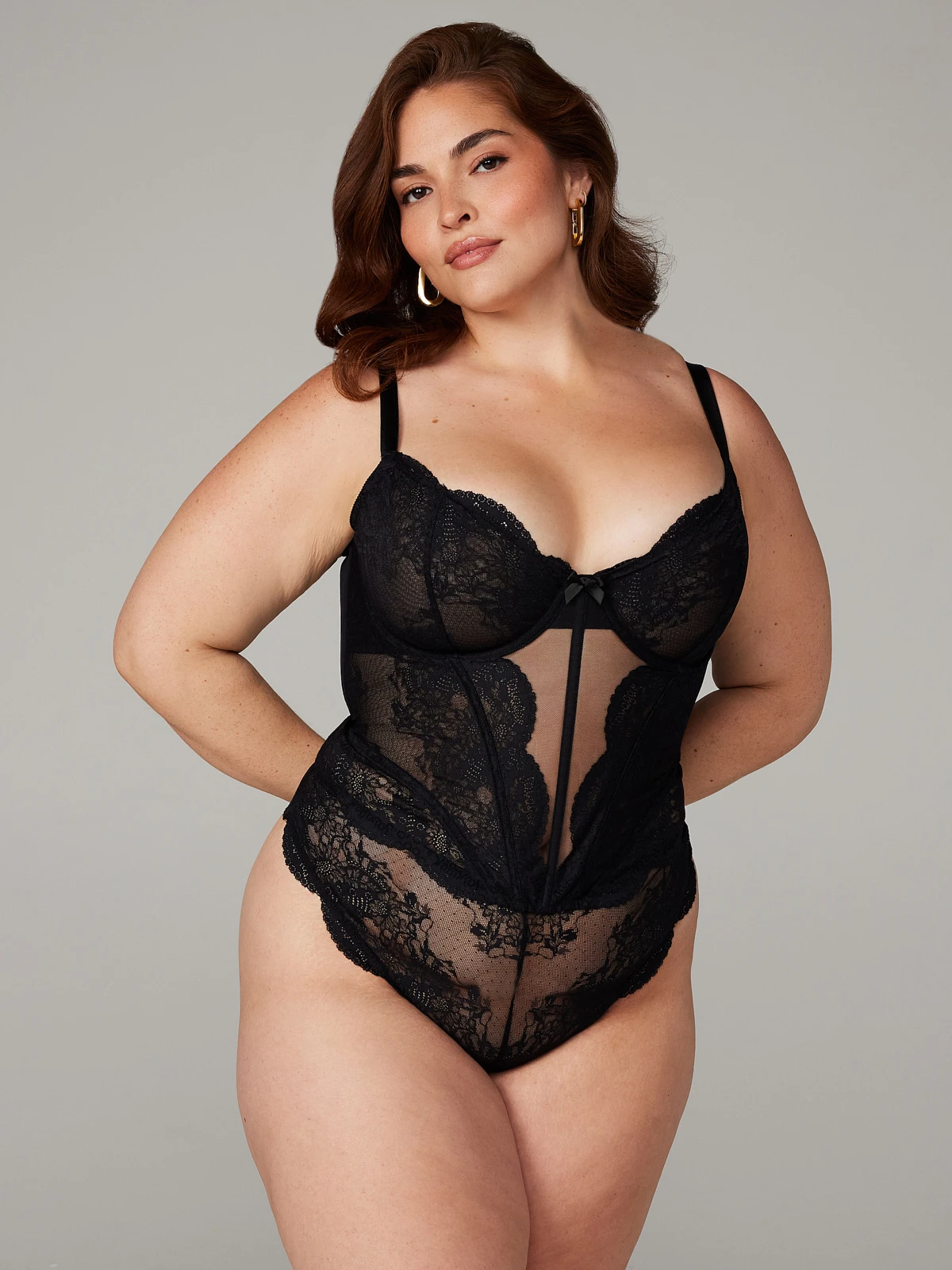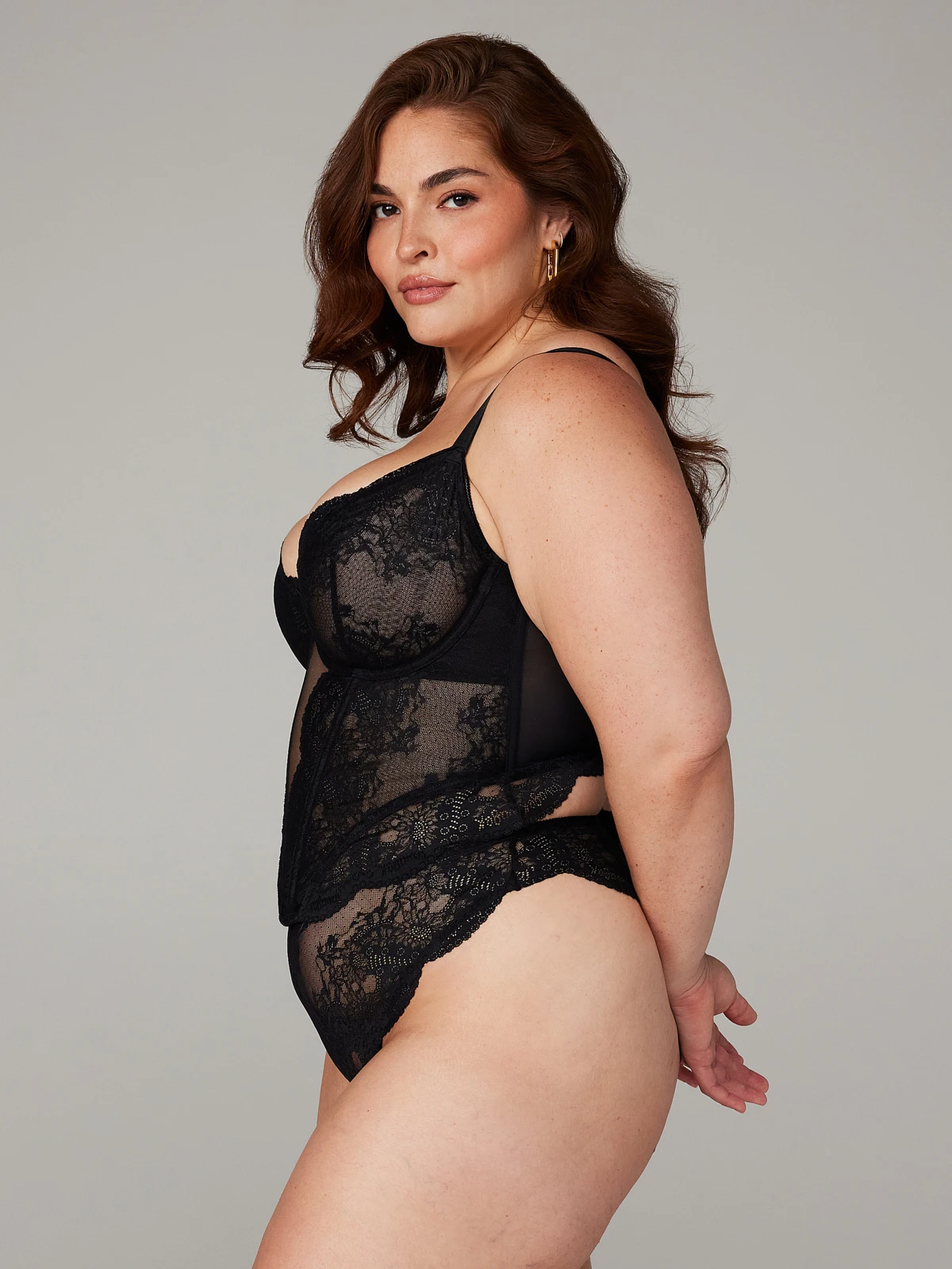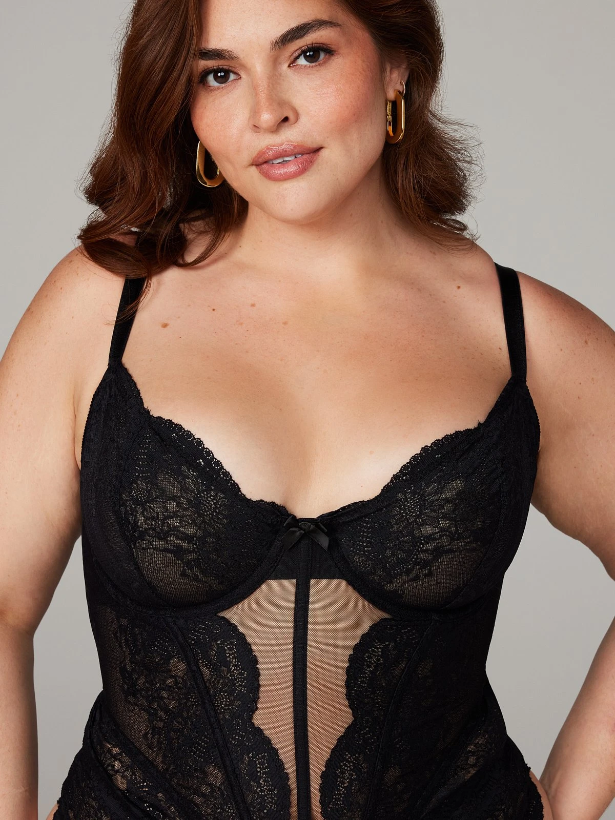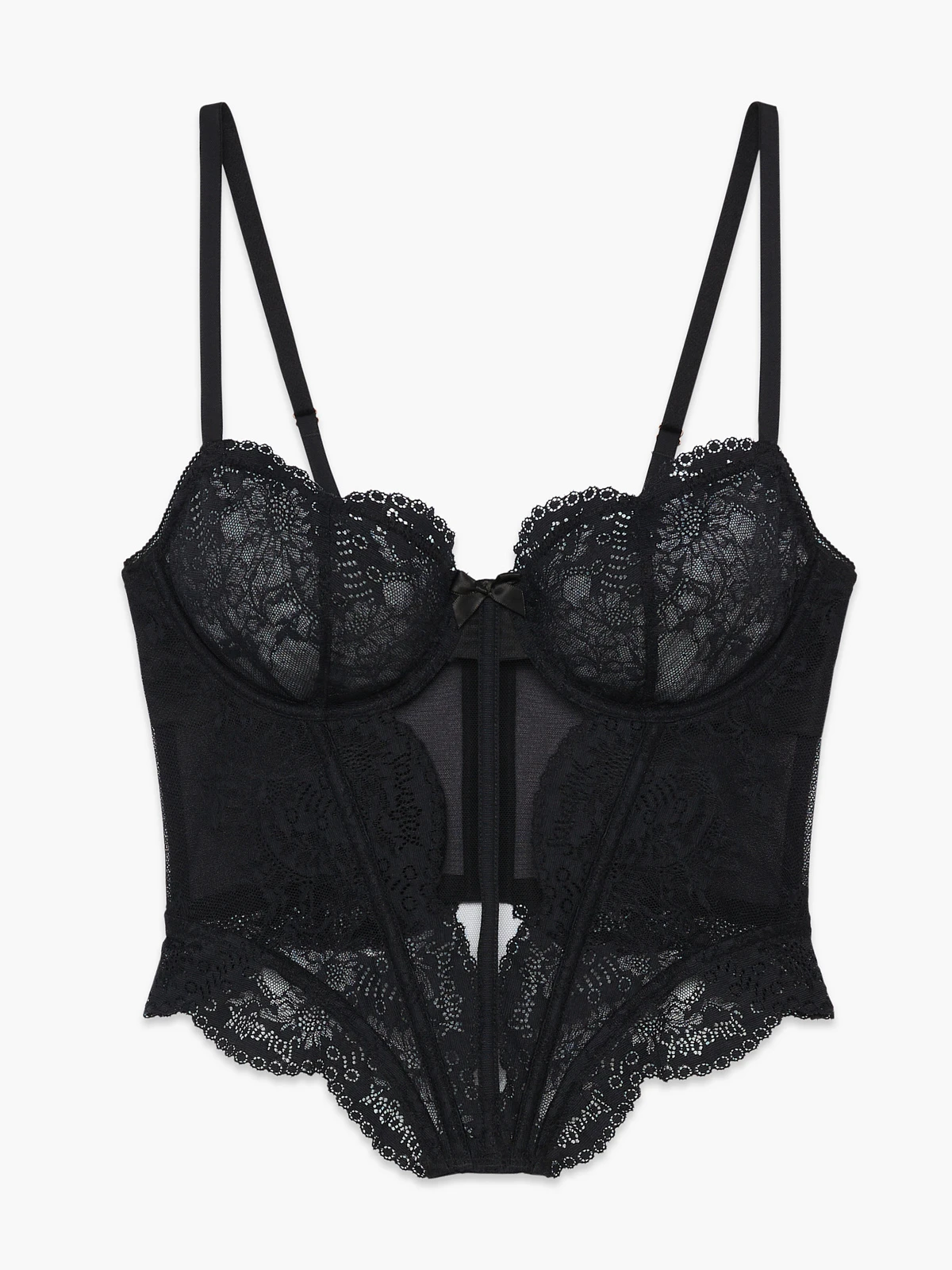 For the Xtravagant type. Our Haute Lace Bustier features custom floral lace, adjustable supportive straps, and adjustable hook-and-eye closure at back.