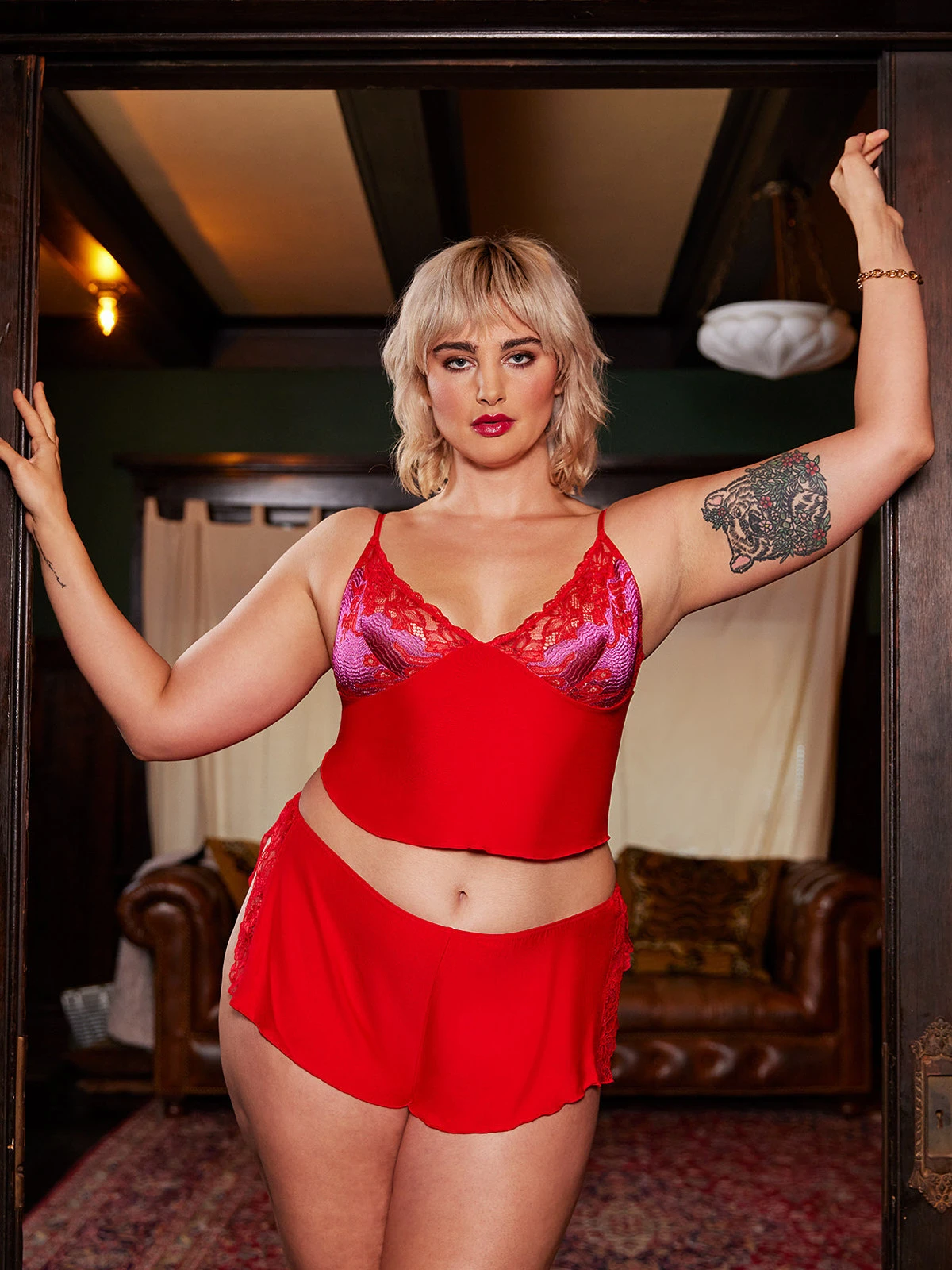 Keep it hot and laced. Our Lace’d Up Cami is slightly cropped with luxe two-tone stretch satin lace.