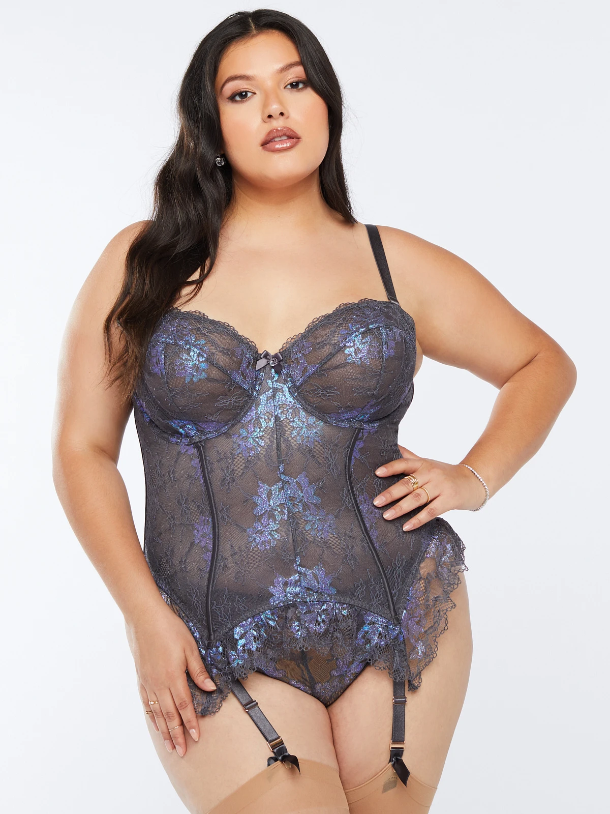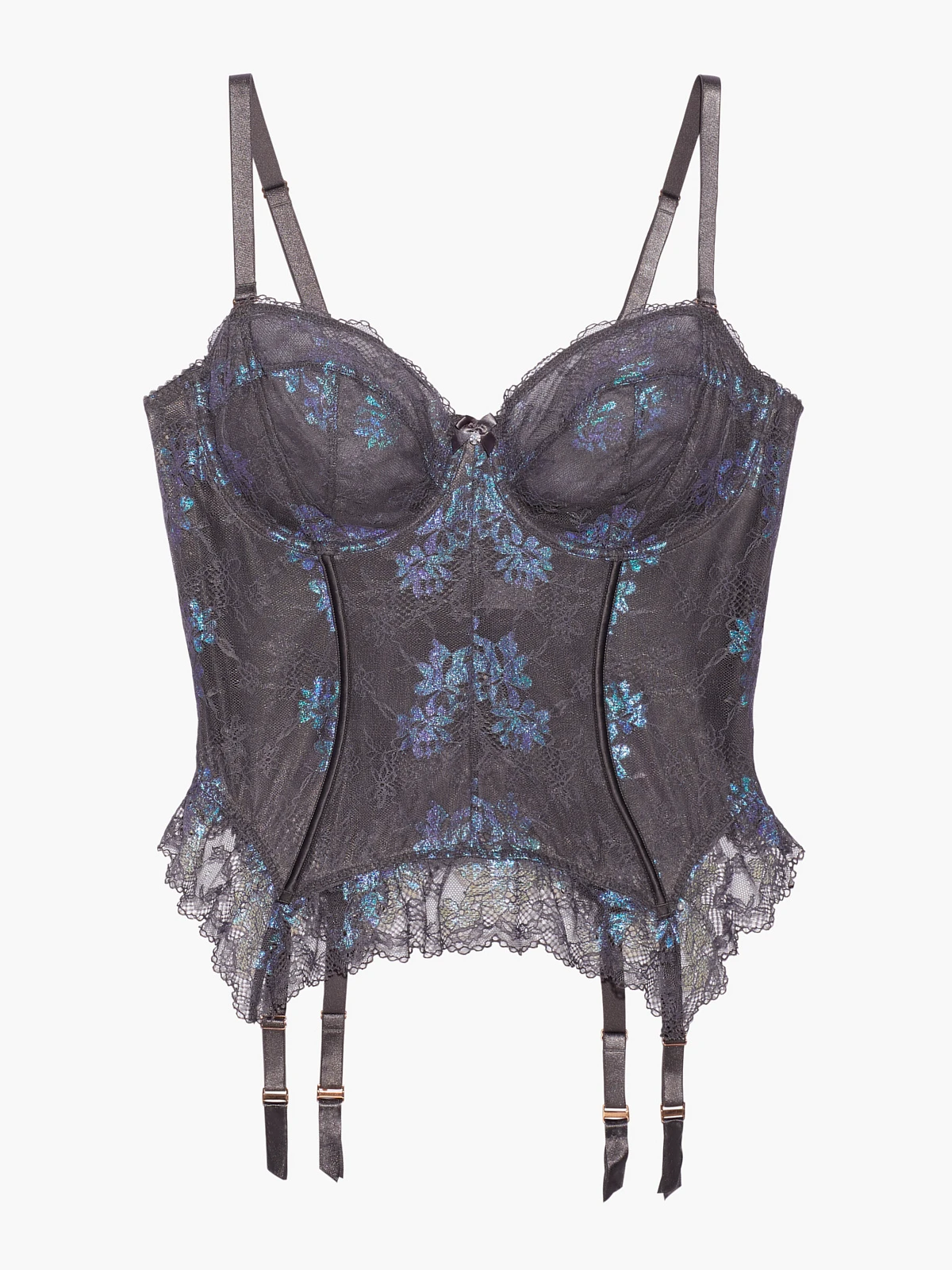 The quintessential lingerie classic you need. Our Living in the Clouds Iridescent Lace Corset features sheer floral lace detail, removable shoulder straps, and figure-enhancing boning to accentuate your curves.