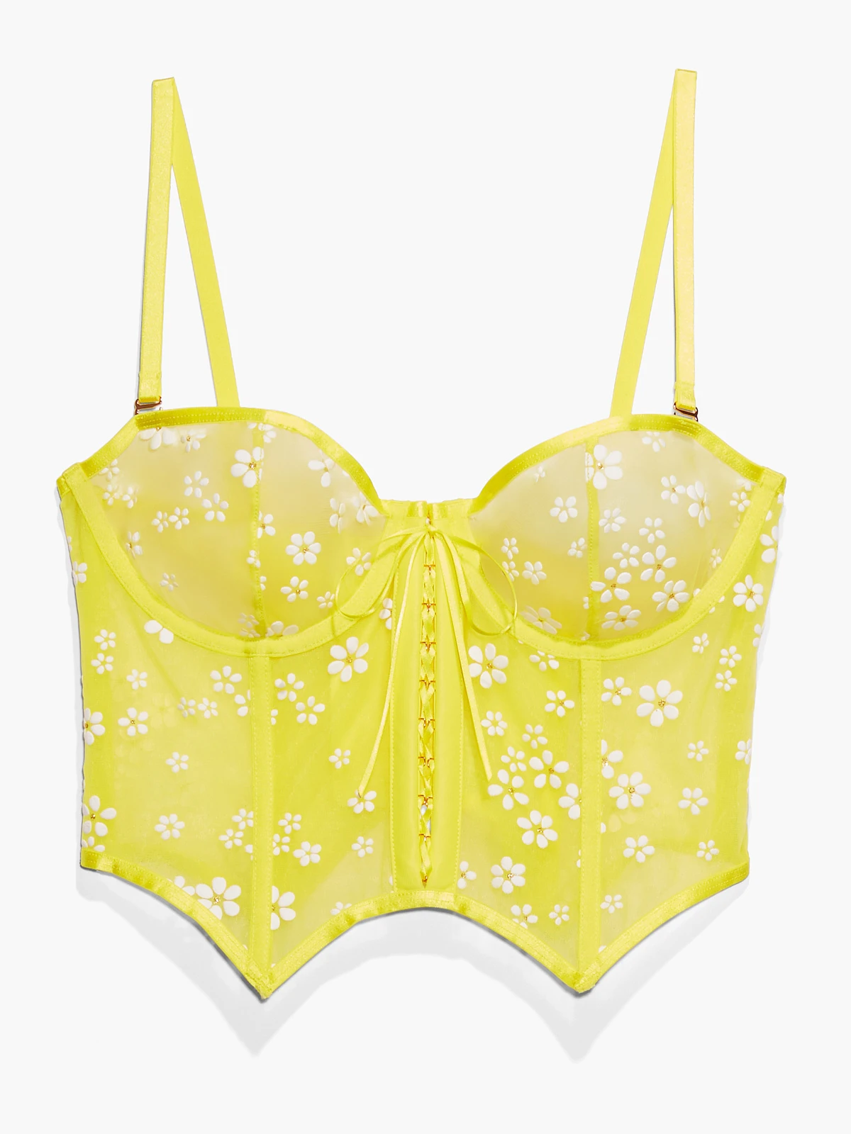 Our Puff Daisy Unlined Bustier is made from a sheer fabric and features interior boning for a structured fit, finished with a sweet puff-print daisy pattern.