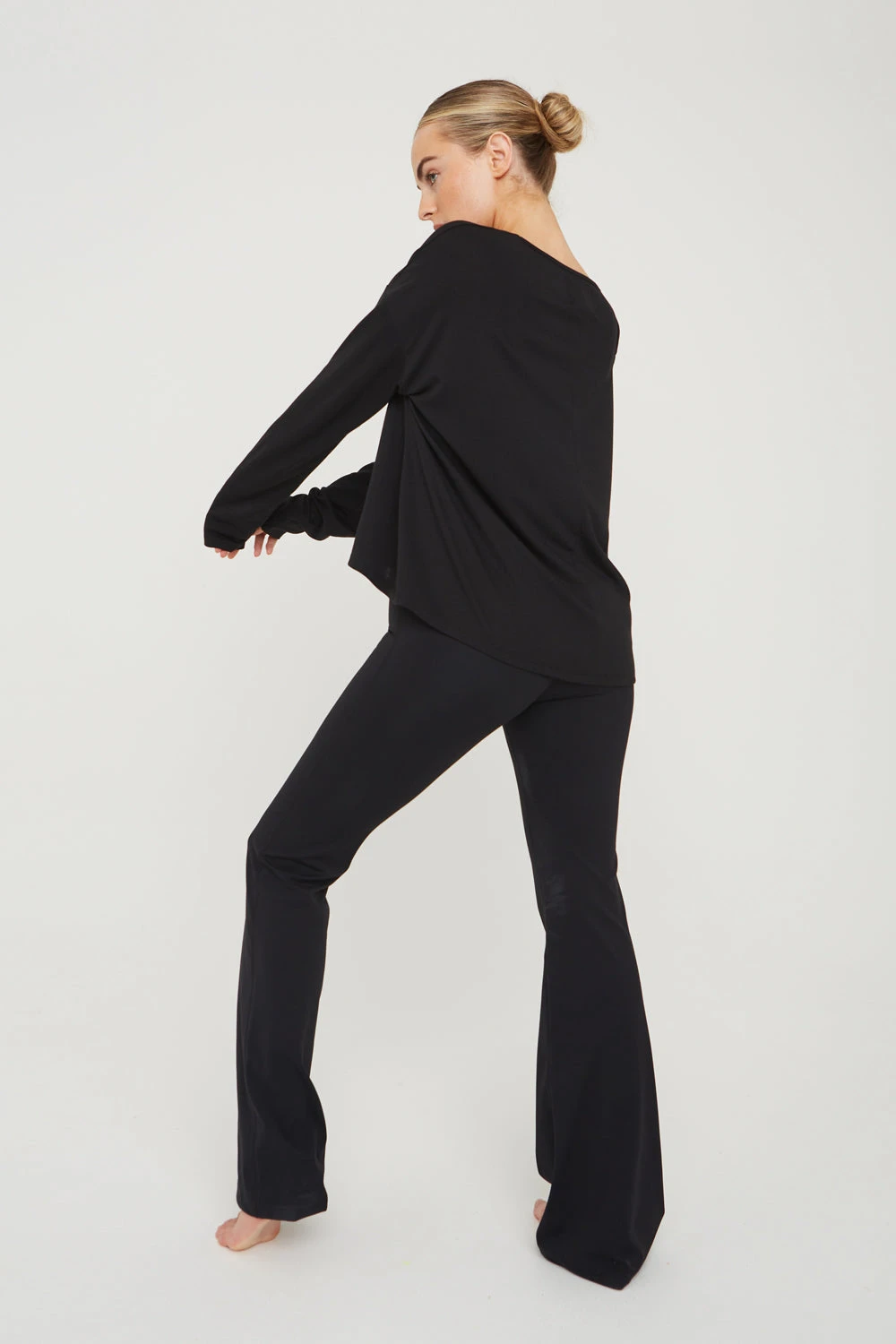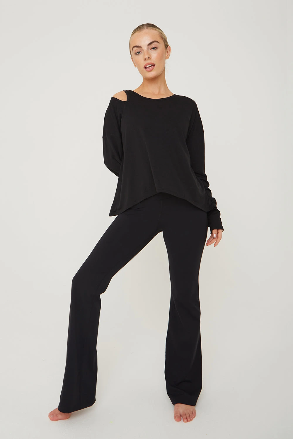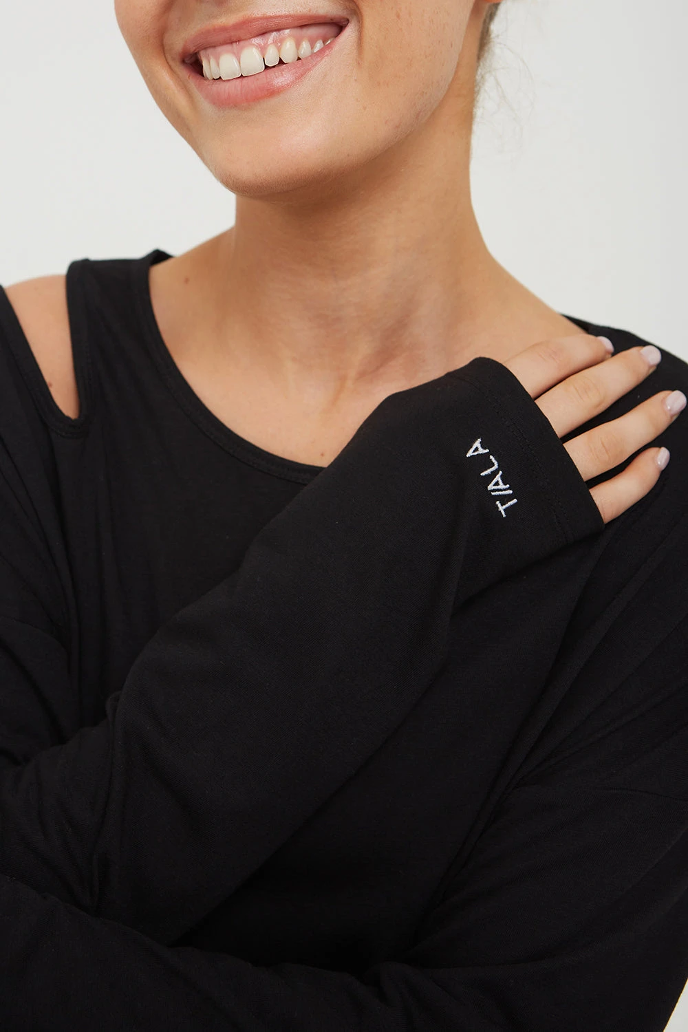 - Long-sleeve, flow-cut top with shoulder cut-out detail