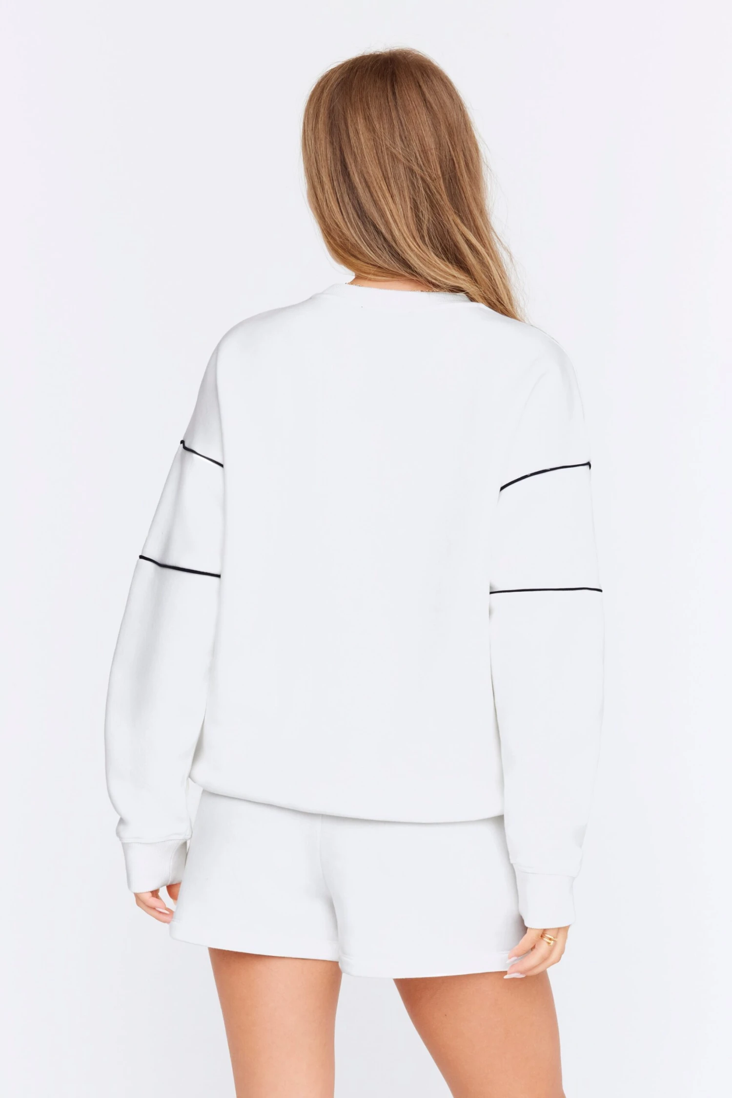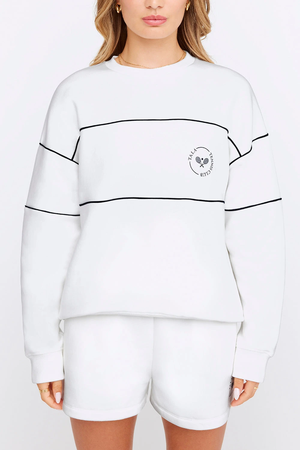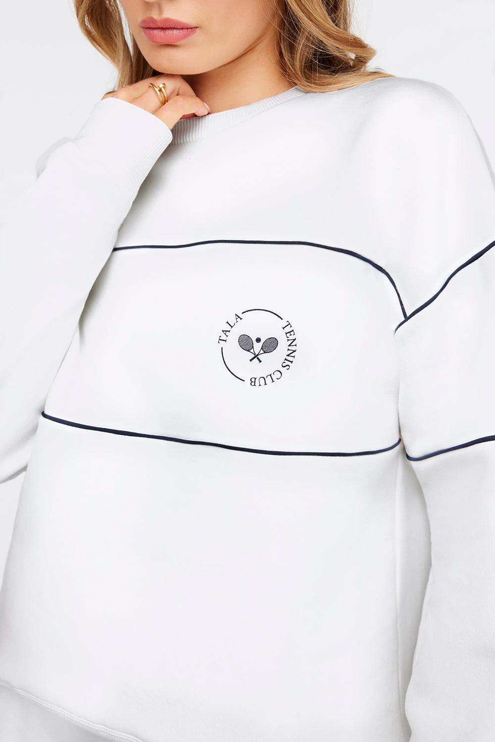 How can a sweatshirt feel elevated? This is how. With just the right amount of preppy style mixed with an oversized shape, you’ll be channelling Diana before you know it. With a dropped shoulder, crew neckline, and loose rib hem for an oversized look, you’ve found your summer layer. Perfect for wearing over our cropped tee, skort, or cycling short, the tennis branding on the chest and contrast piping panel across body and sleeve gives it an elevated look without compromising on comfort. Made in the perfect Navy and White colourways, it’s ideal tennis vibes.