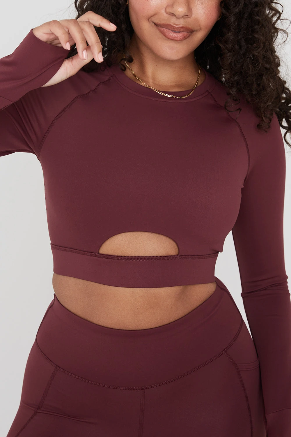 The ultimate workout companion to keep you moving whatever the weather, perfect for hitting the gym or the park. Long sleeve crop top design with flattering keyhole cut-out to the front and handy thumbholes.Â