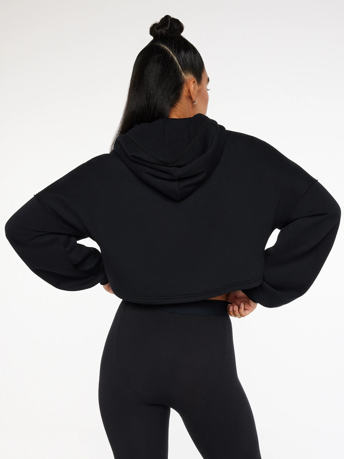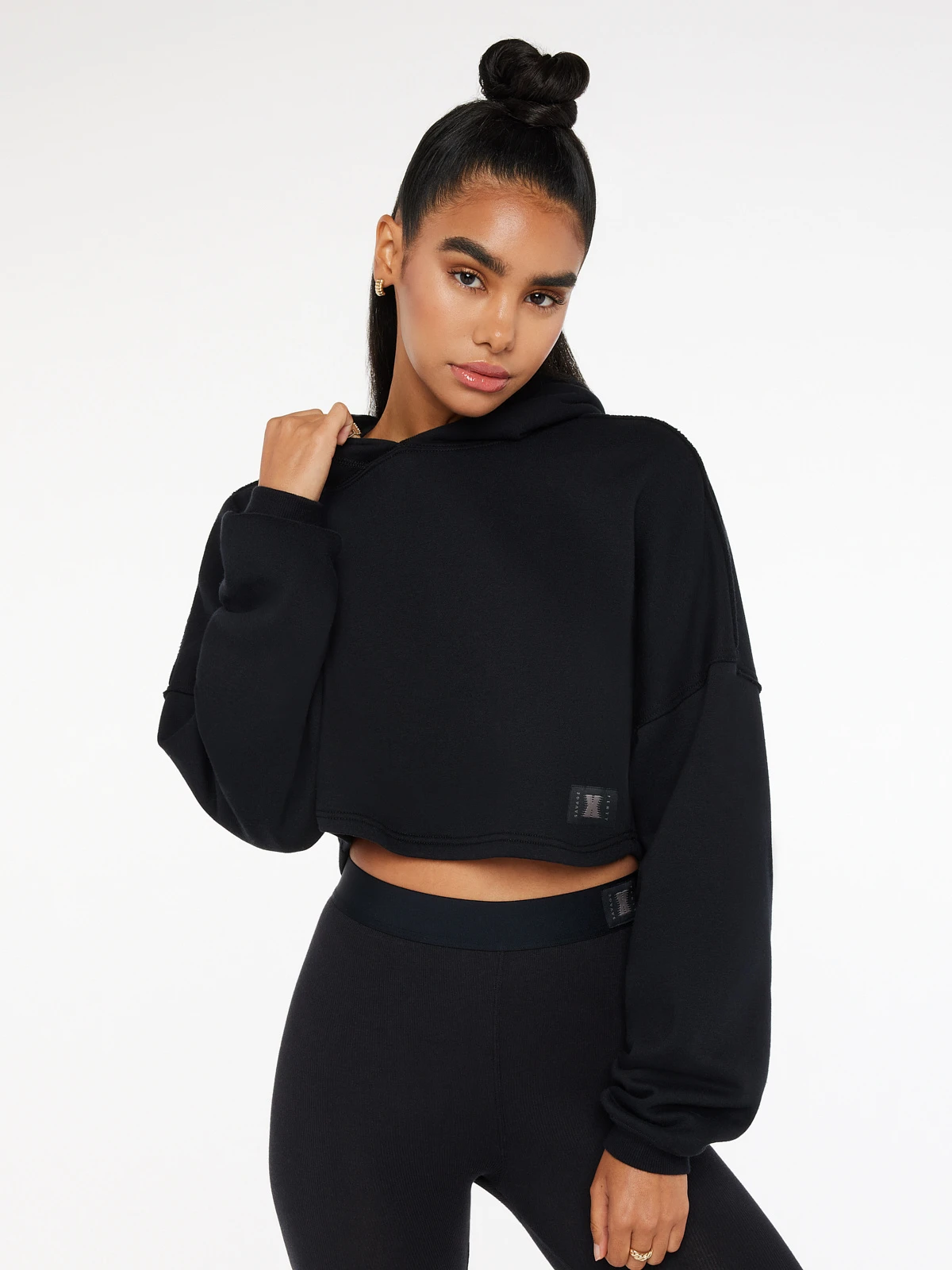Never miss a beat in our fleece Xssential Crop Hoodie, featuring a drop shoulder seam, raw edge details, and our X logo on the front hem.